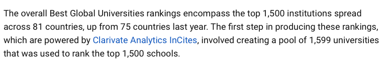 在U.S.News的官方说明中,此次排名方法有如下变化:“总体而言,全球最佳大学排行榜涵盖了81个国家和地区的1500所顶尖大学,高于去年的75个国家和地区。”
