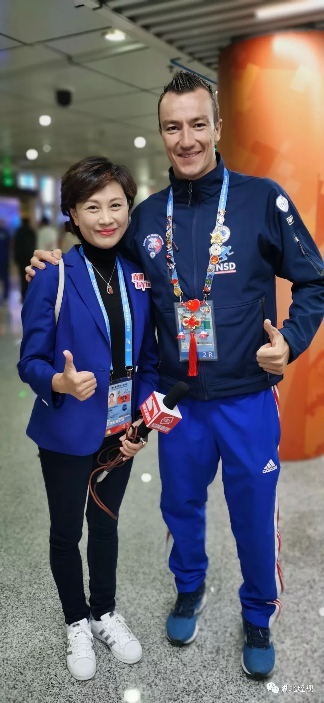 在闭幕式开始前,我们记者碰到的一位法国运动员,他胸前的吊牌挂满了徽章,从外观看,来自各个国家,最有趣的是他把一个中国结挂在下面,两旁各挂一个埃菲尔铁塔的模型。