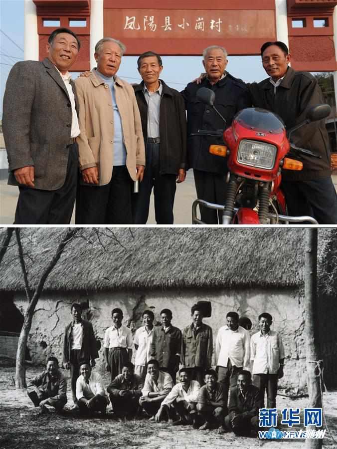 上图:当年“大包干”带头人关友江、严俊昌、严金昌、严学昌、关友申(从左至右)在安徽省凤阳县小岗村牌楼前合影(新华社记者王雷2008年10月7日摄)。 下图:部分“大包干”带头人在实行农业“大包干”初期在茅草屋农舍前的合影(资料照片)。新华社发