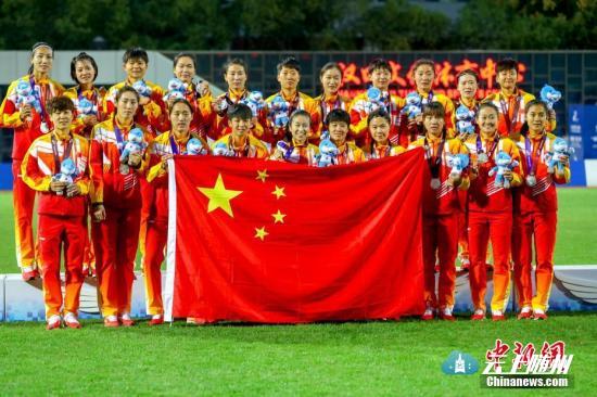 资料图:10月26日,第七届世界军人运动会女子足球决赛在湖北省武汉市举行。朝鲜女足2:1战胜中国女足获得冠军。图为中国队获得亚军合影。 中新社记者 张畅 摄