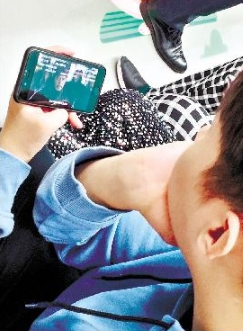 昨日9时许,记者从地铁2号线积玉桥站上车,去往天河机场方向。记者注意到,坐着的乘客几乎都低着头在看手机,其中一排座位上,6个人中有2个人在刷抖音小视频,一人戴着耳机,一人开着外放,不过声音并不大。
