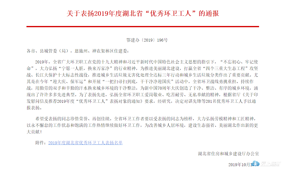近日,省住建厅公布了2019年度湖北省优秀环卫工人表扬名单,对谌先锋等201名优秀环卫工人予以通报表扬。