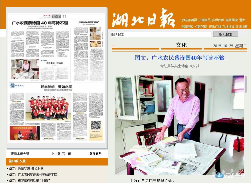 2017年11月15日,省作协邀全国众多诗人到广水市蔡河镇徐店村蔡家冲,在蔡诗国家中,举办“农民诗人蔡诗国诗歌作品研讨会”,方式如此独特,很知名的诗人也没谁享受到。而且,不光研讨他的诗,还有他两个弟弟一个妹妹的诗。兄妹四人写诗40多年,共出诗集30多部,获誉“诗坛蔡家军”。山东诗人许庆胜赞叹:“我不停望着秋寒中颤抖的大山”。