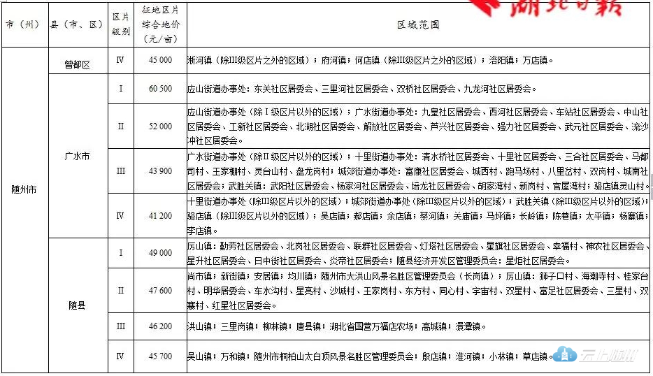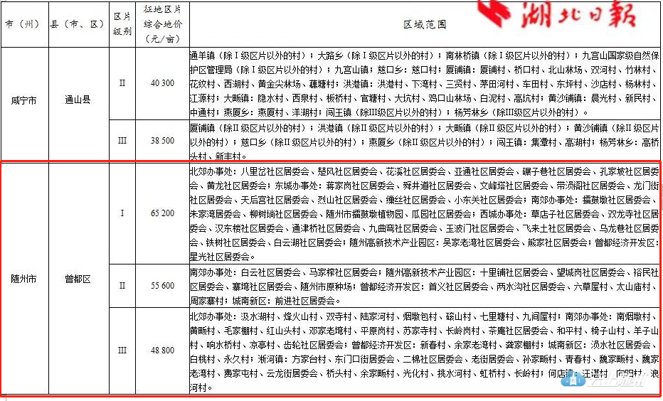 新一轮的《湖北省征地区片综合地价标准》,明确各县(市、区)的征地区片级别、价格及区域范围。此次调整,采用仅制定征地区片综合地价,不再保留统一年产值标准的方式,包括土地补偿费、安置补助费两部分,不包括地上附着物和青苗补偿费等。