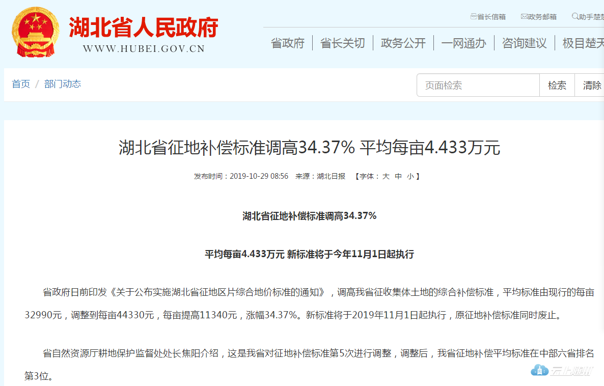 近日,湖北省人民政府印发《关于公布实施湖北省征地区片综合地价标准的通知》,公布了调高征收集体土地综合补偿标准,平均标准由现行的每亩32990元,调整到每亩44330元,每亩提高11340元,涨幅34.37%。新标准将于2019年11月1日起执行,原征地补偿标准同时废止。