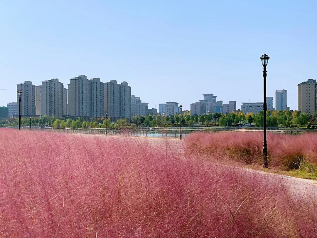 道路两旁,停满各地赶来的车辆,小吃摊、水果摊一溜排开,游客们徜徉花海,跳舞、拍照、晒美景,尽情享受粉黛海洋的浪漫温情。而在“网红草”四周,河水清澈、树木葱茏、高楼林立,一片城市美景尽收眼底。