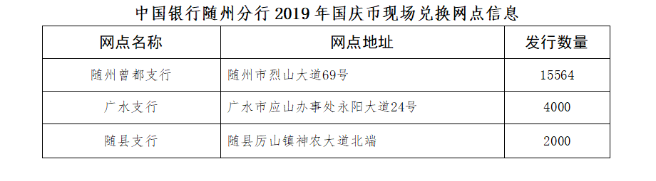 中华人民共和国成立70周年普通纪念币(以下简称“国庆币”)将于2019年11月5日至2019年11月7日进行现场兑换,国庆币面额10元,与人民币等值流通。随州市现场兑换发行数量为21564枚,现场兑换工作由中国银行随州分行及其分支机构承担。现将有关事项公告如下: