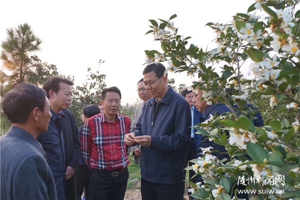 今年9月17日,习近平总书记在河南省信阳市光山县调研油茶产业时指出,“要坚持走绿色发展的路子,推广新技术,发展深加工,把油茶业做优做大,努力实现经济发展、农民增收、生态良好。”随州山区林地面积大,气候适宜木本油料生长,同时,木本油料也是很好的生态树种,集生态、经济、社会效益于一身,一年栽种、百年受益。位于澴潭镇刘庙村的随州市慧勤生态农业有限公司万亩油茶基地,1500余亩油茶已经进入初产期,一座座山头上,白色的油茶花正在盛开,嫩绿的油茶果挂满了枝头,长势喜人。陈瑞峰走进油茶林,仔细查看油茶结果情况,详细询问基地建设、经营运转和油茶产业带贫情况。据介绍,明年部分油茶树将进入丰产期,亩产值达4000元,届时可以带动周边两百余户农民增收。陈瑞峰强调,油茶产业在我市实施乡村振兴战略、巩固脱贫攻坚成果中拥有巨大的生态优势和潜力。要认真学习贯彻习近平总书记重要讲话精神,坚持走以“生态优先、绿色发展”为导向的高质量发展新路子,因地制宜大力培育油茶产业,推广新技术,发展深加工,努力把油茶产业做成农民增收、企业增效的绿色产业。