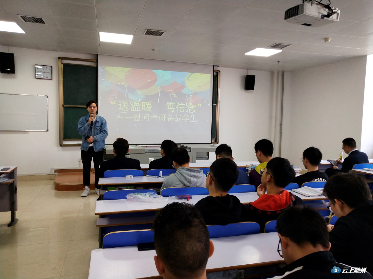 操传斌院长发表讲话。他指出同学们要劳逸结合,拥有强健的身体才是成功的前提,其次要坚持考研初心,抛弃一切杂念和干扰,坚定信心,最后他祝愿同学们能够取得心仪的成绩,迈入硕士研究生行列,预祝五院2020年考研率突破历史新高。