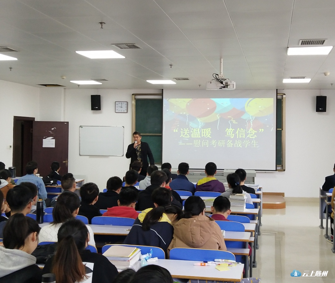 2020年全国硕士研究生招生考试在即,为了了解我院考研学生的备考情况,帮助学生树立考研信心,11月5日上午9点,五院在随州校区明德楼201教室举办“送温暖 笃信念”慰问考研备战学生活动。湖北医药学院附属随州医院副院长、第五临床学院院长操传斌、附属随州医院党委委员、第五临床学院副院长胡必富、教学管理办公室主任张卓、学工办副主任金玉华、辅导员老师及五院在随州实习备战考研学生参加此次活动。活动由金玉华老师主持。