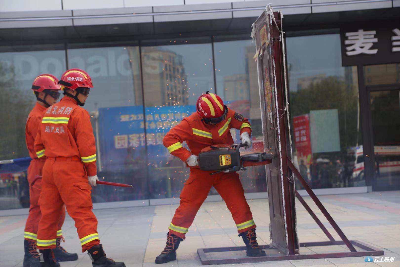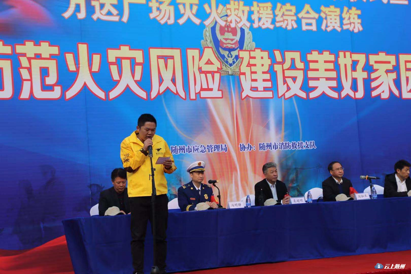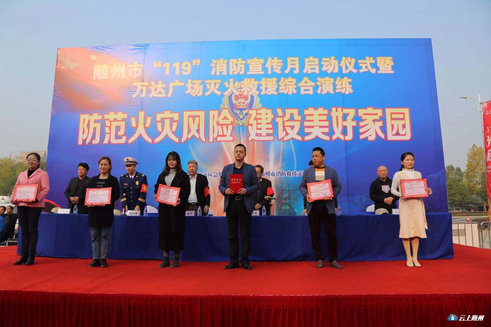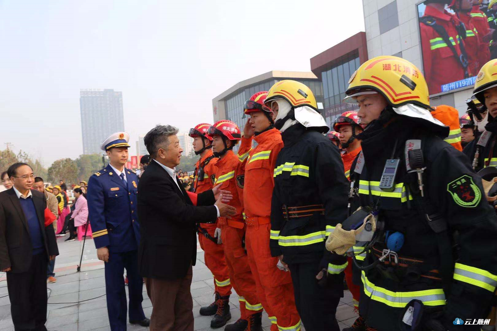 11月8日上午,随州市举行2019年“119”消防宣传月活动启动仪式暨万达广场灭火救援演练。与会领导为12个消防安全优质课获奖教师颁发证书;美团外卖公司志愿者代表上台作了倡议发言,号召广大市民为营造良好的社会消防安全环境贡献自己的力量。启动仪式结合后,与会领导和广大群众观看了万达广场灭火救援演练。