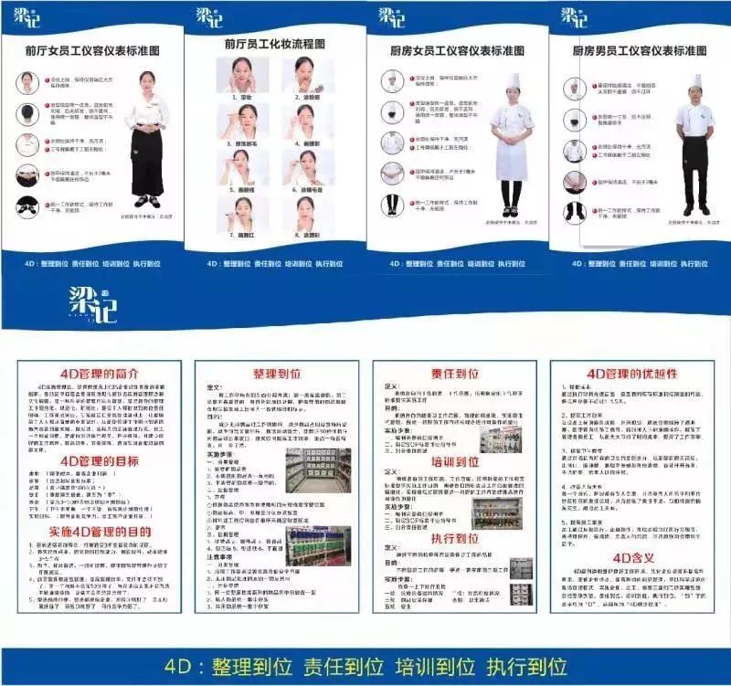 4D是指整理到位、责任到位、培训到位、执行到位。4D食品安全现场管理体系主要通过分区、分类、分层、分颜色、定名、定量、定位、定向、定流线等系列操作流程,实现经营现场的整齐划一、整洁有序,是一套促安全防事故、降成本升利润的系统标准。
