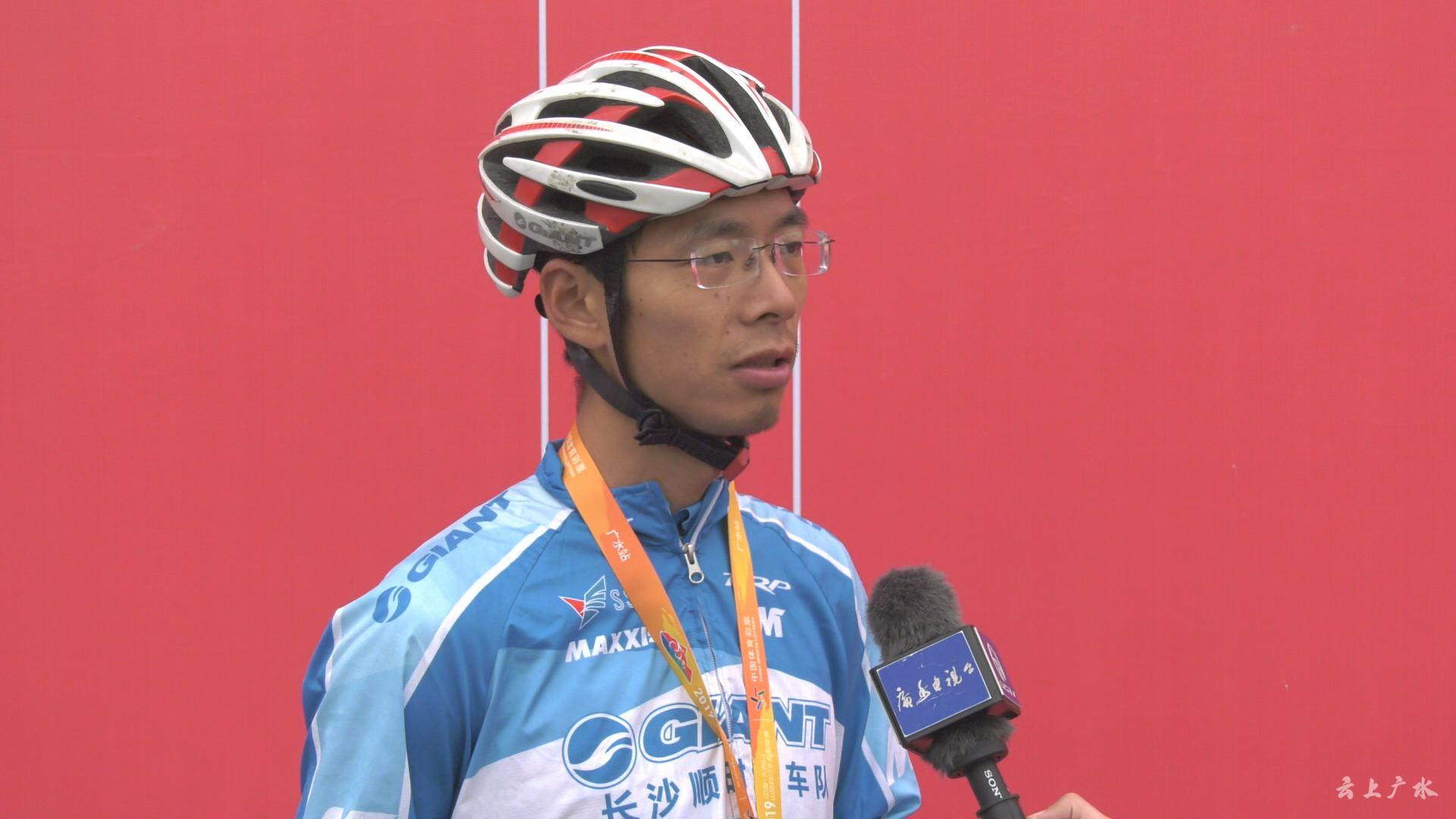 (同期声)男子精英组冠军陈凯:把自己体能储备的比较好,今天出发以后,在七、八公里的地方抓住机会突围了,顺利的一个人单飞到终点拿到冠军,很开心。