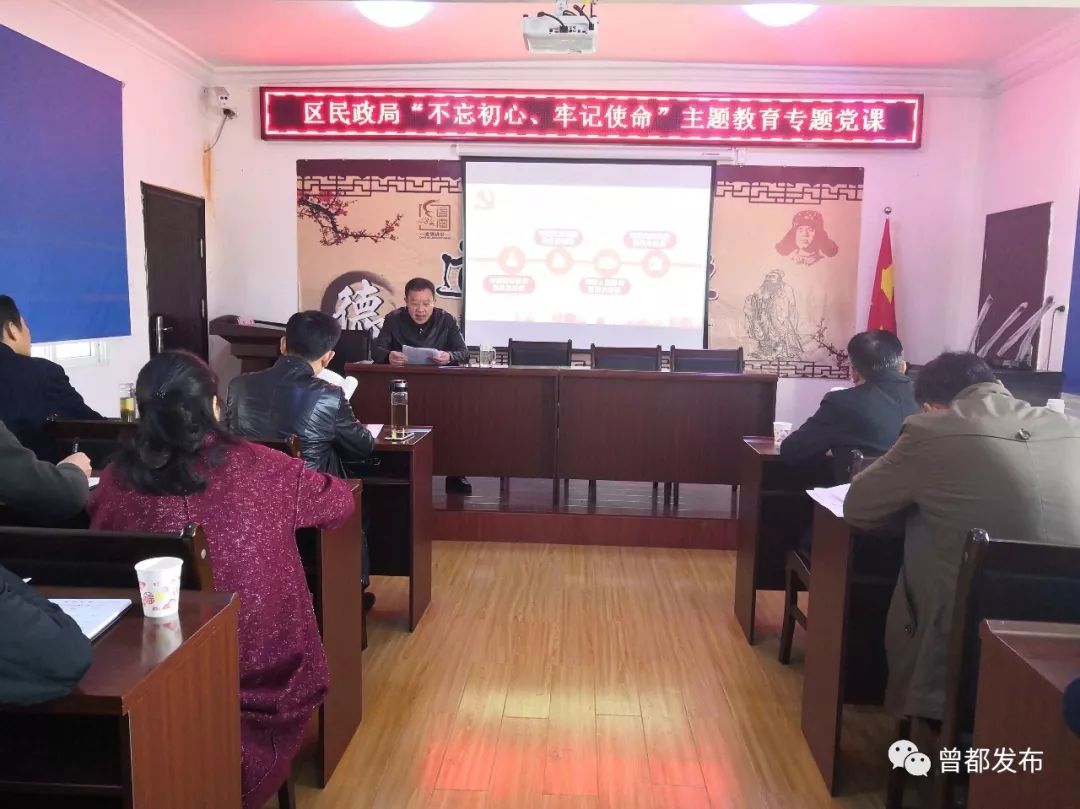 11月19日,曾都区民政局开展“不忘初心、牢记使命”主题教育,局党组书记、局长刘梦以《初心使命 根植于思想 落实于行动》为题讲授党课。曾都区委第十巡回指导组到会指导。 编 辑:刘欣明 责 编:鲁京京 审 核:魏云峰 陈凡