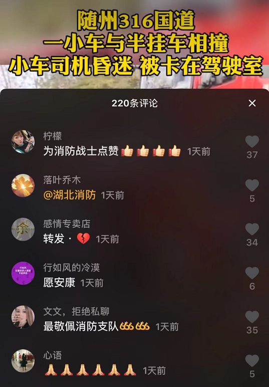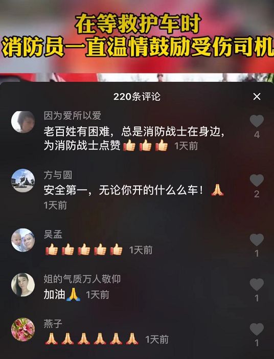 一则#消防员温情鼓励受伤司机#的视频