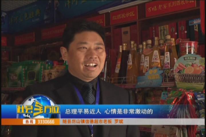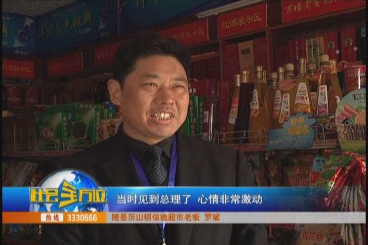 【采访】随县厉山镇信德超市老板 罗斌 当时见到总理了,心情非常激动。这么近距离地和总理握手,总理平易近人,心情是非常激动的,不知道说什么好那个场面一看,从来没见过,在人民大会堂这个光辉的殿堂里,你都不知道该怎么好了,大家代表的心情都一样,都非常激动。