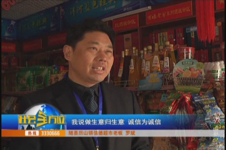 【采访】随县厉山镇信德超市老板 罗斌 我记得有一次,一个客户在我这里买了一个电视机,买了一个冰箱,是一万多块钱,他当时多数了1000块钱给我。他已经出门后我发现,怎么这么多钱,多一千块,最后我又骑上车追上他,把这1000块退给他,他当时很感动,他说,当时还价10500你不干,现在你把这1000块送给我,我说做生意归生意,诚信为诚信,你多给的钱我肯定不会要。