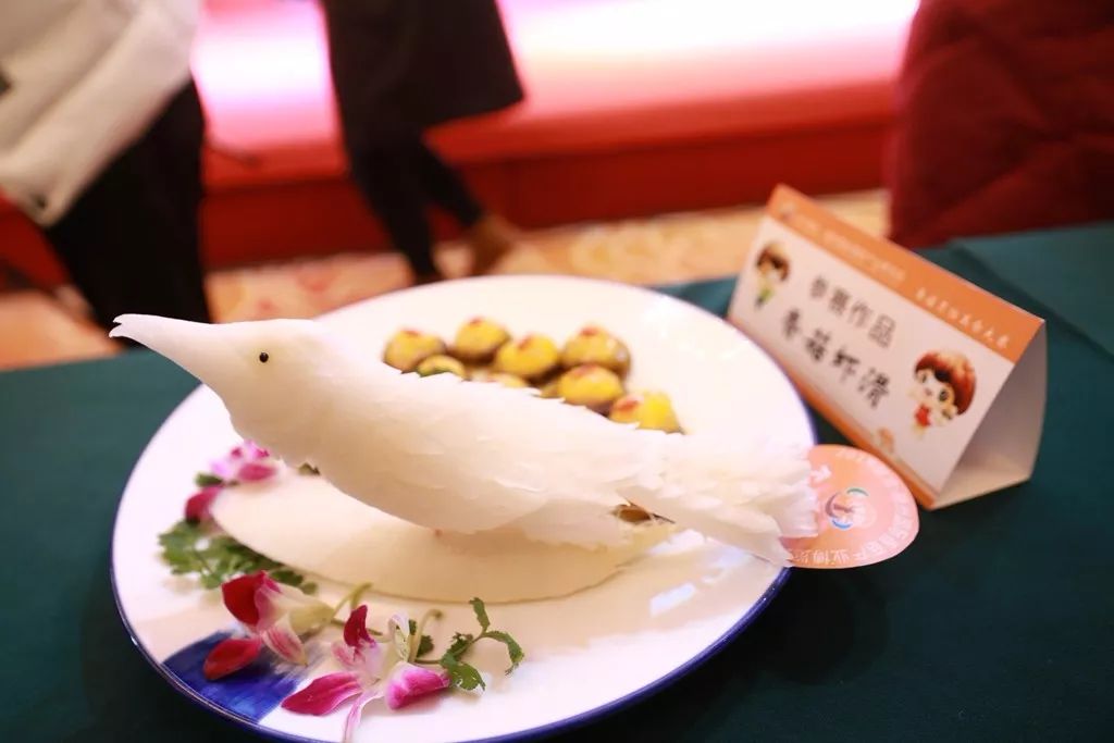 展台上,精彩不断。香菇片拼出玫瑰花,多种食材拼出银杏叶;鱼头和香菇一摆,就是一幅孔雀开屏;12串香菇挂上架台,就像一套完整的编钟……“太美了,这是怎么做到的?”现场观众感叹声不断。