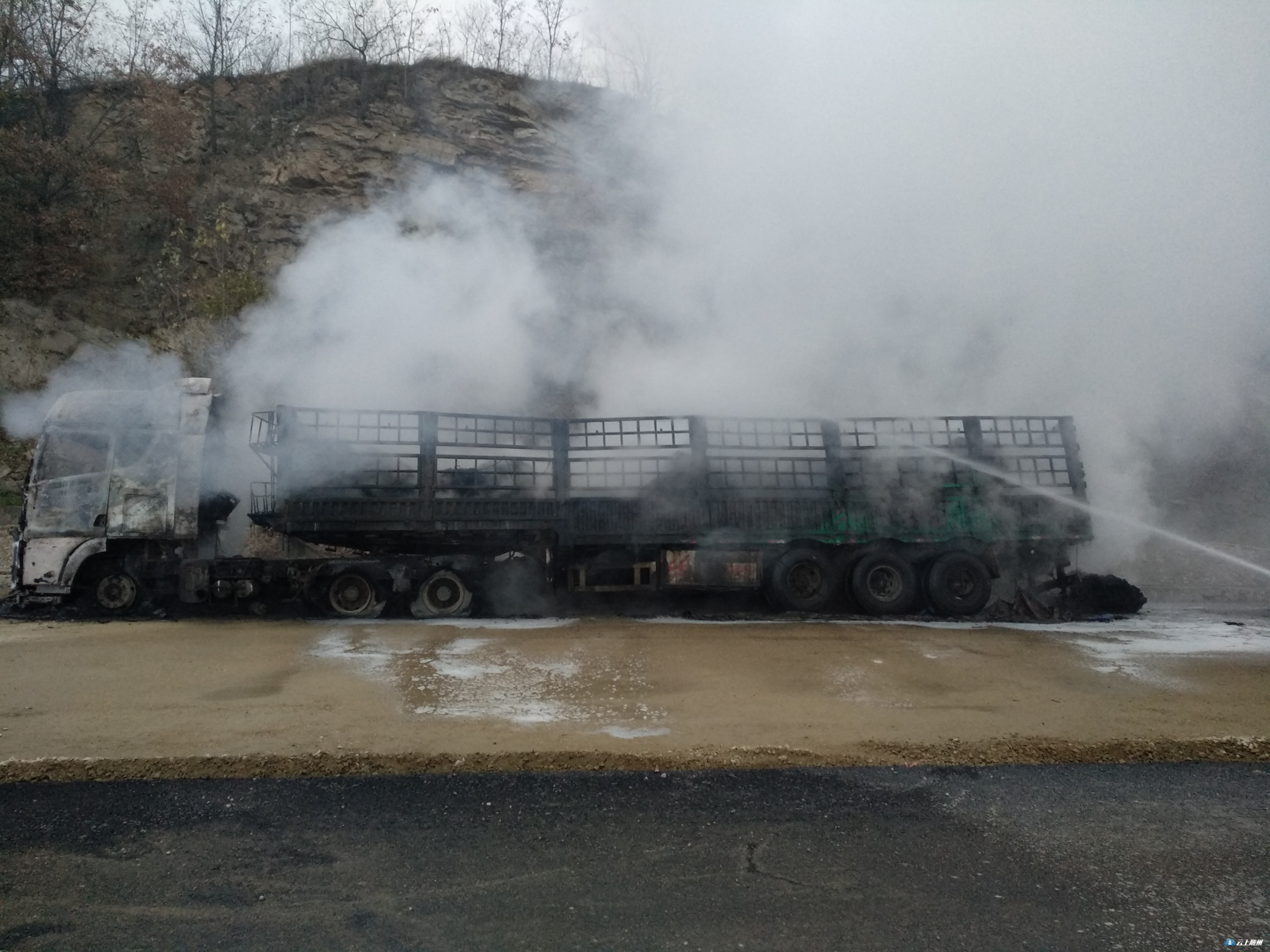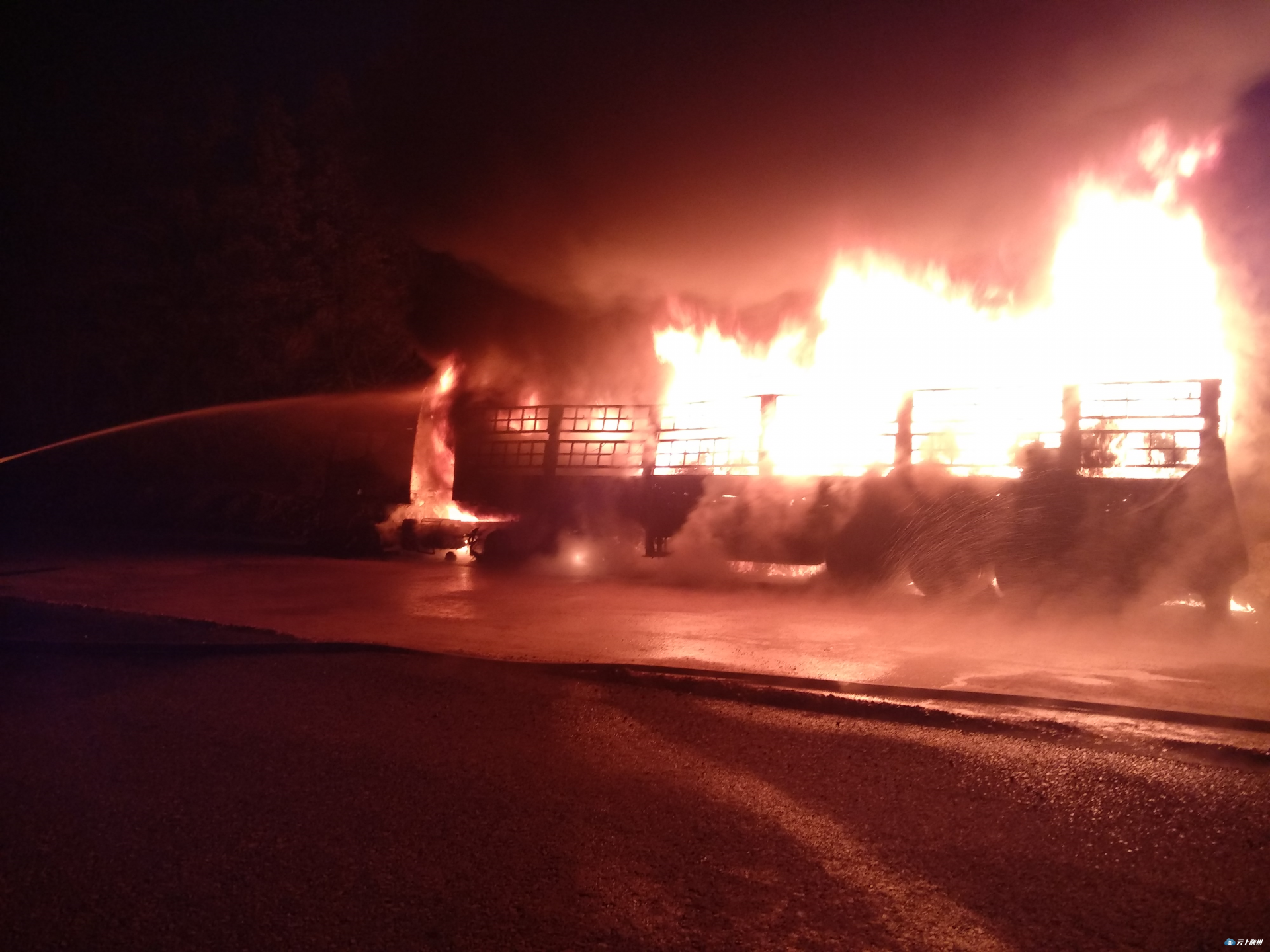 消防指战员到达现场后,发现这辆货车整个车身都被大火吞噬,情势十分危急。经侦查发现,货车上货物为塑胶,火势已经完全蔓延。根据现场情况,指挥员立即下令展开扑救,灭火组:使用两支枪,一支对油箱部位进行冷却,另一支对火势进行扑灭;警戒组:做好警戒,防止爆炸伤人;供水组:寻找水源,保证火场不间断供水。经过一个小时的奋力扑救,明火被彻底扑灭。为防止复燃,消防指战员对驾驶室、货物等部位进一步进行冷却降温,在确认无复燃可能后整理器材归队。