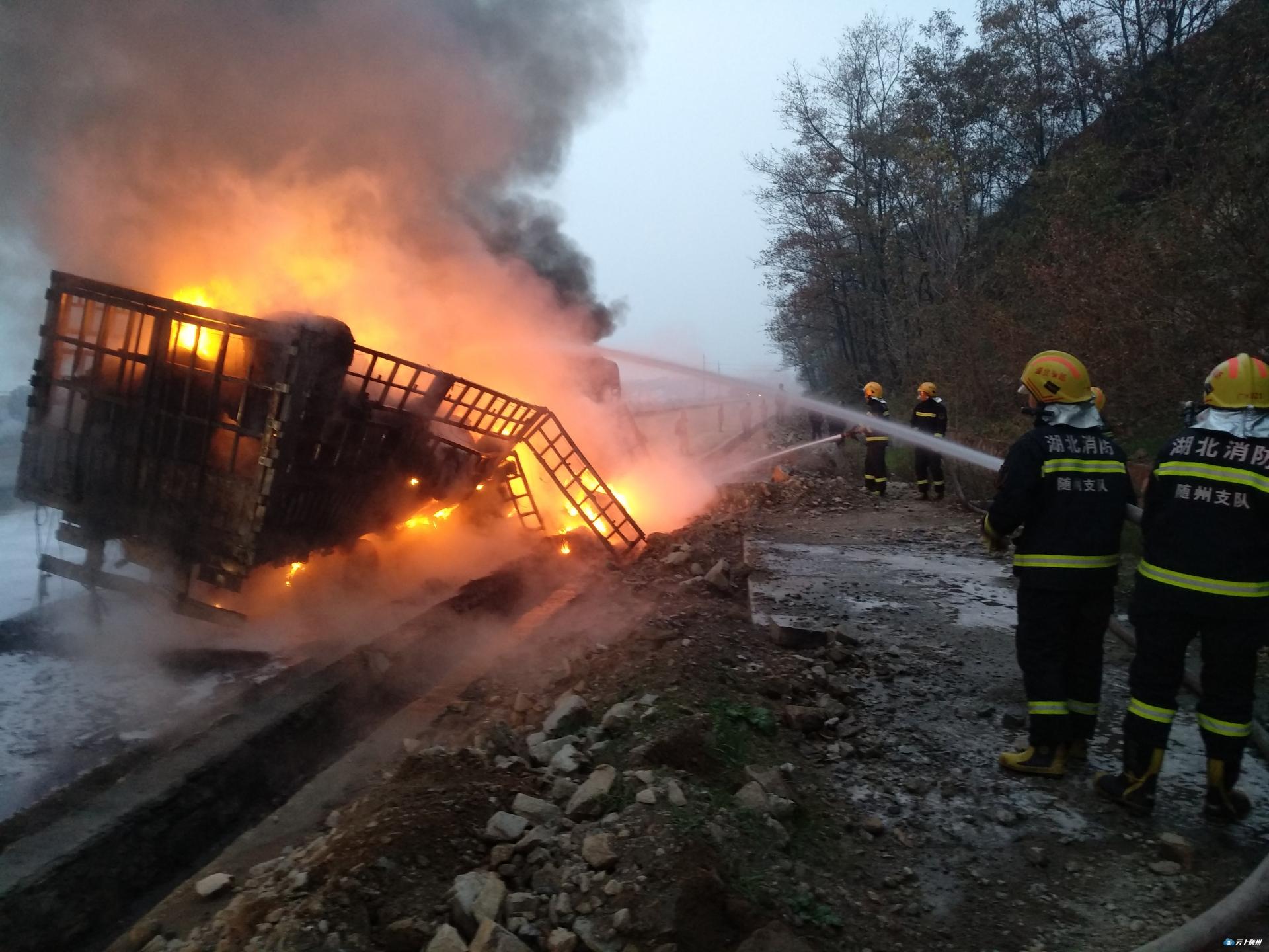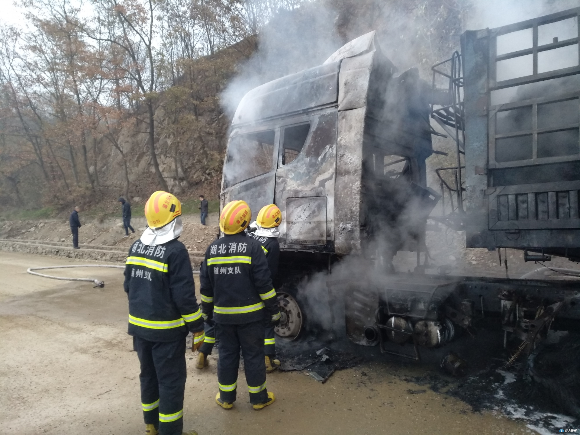 12月1号凌晨5时55分,广水市107国道新火车站武胜关一货车突然燃起大火,随州市消防救援支队广水中队接到报警后,立即出动3辆消防车16名消防指战员赶赴现场处置,并成功将大火扑灭。