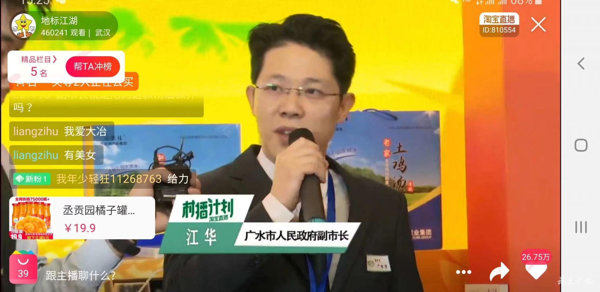 广水市副市长江华带队参加湖北省2019年农村电商发展峰会暨淘宝直播村播计划启动仪式,并在阿里巴巴淘宝直播间为广水代言,向全国观众推荐广水自然佳土鸡汤并在现场与全国的“宝宝”们互动,宣传推荐广水,将广水特色农产品卖向全国。