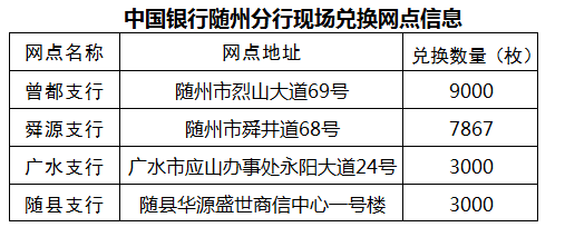 二、现场兑换银行及网点:本次现场兑换由中国银行随州分行负责,具体承兑网点为中国银行曾都支行、舜源支行、广水支行、随县支行。