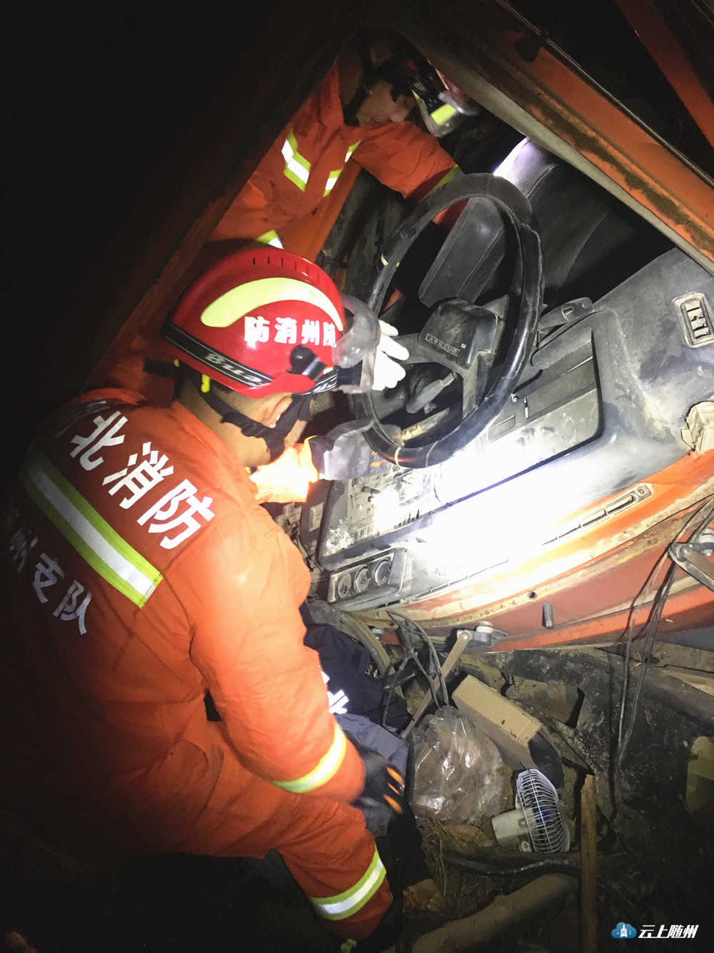 12月6日18点44分,淅河镇大堰坡独山村核桃基地附近两车相撞,一卡车司机被困,情况紧急,急需救援。接到报警后,随州消防开发区中队火速出动赶赴现场救援。