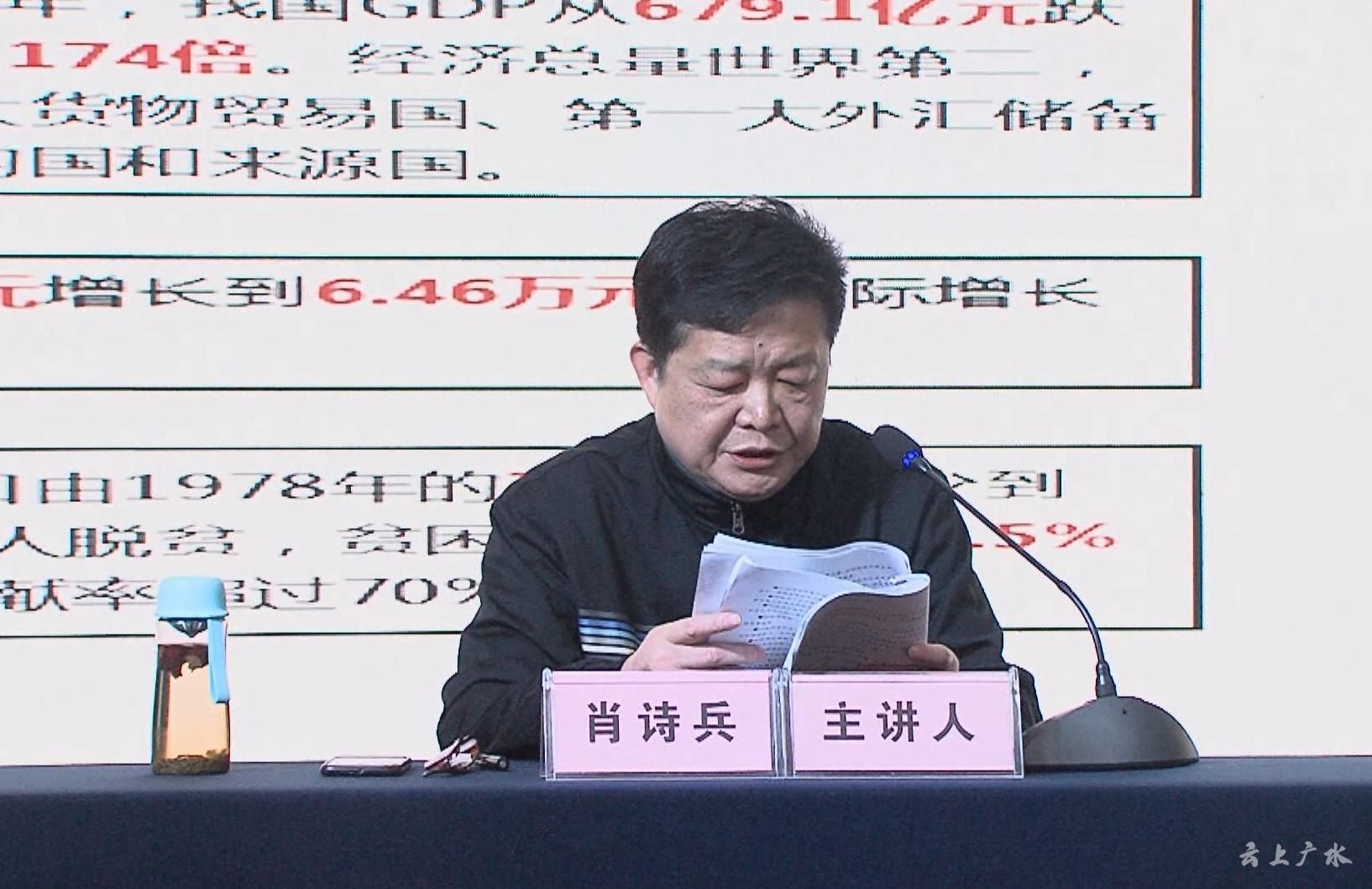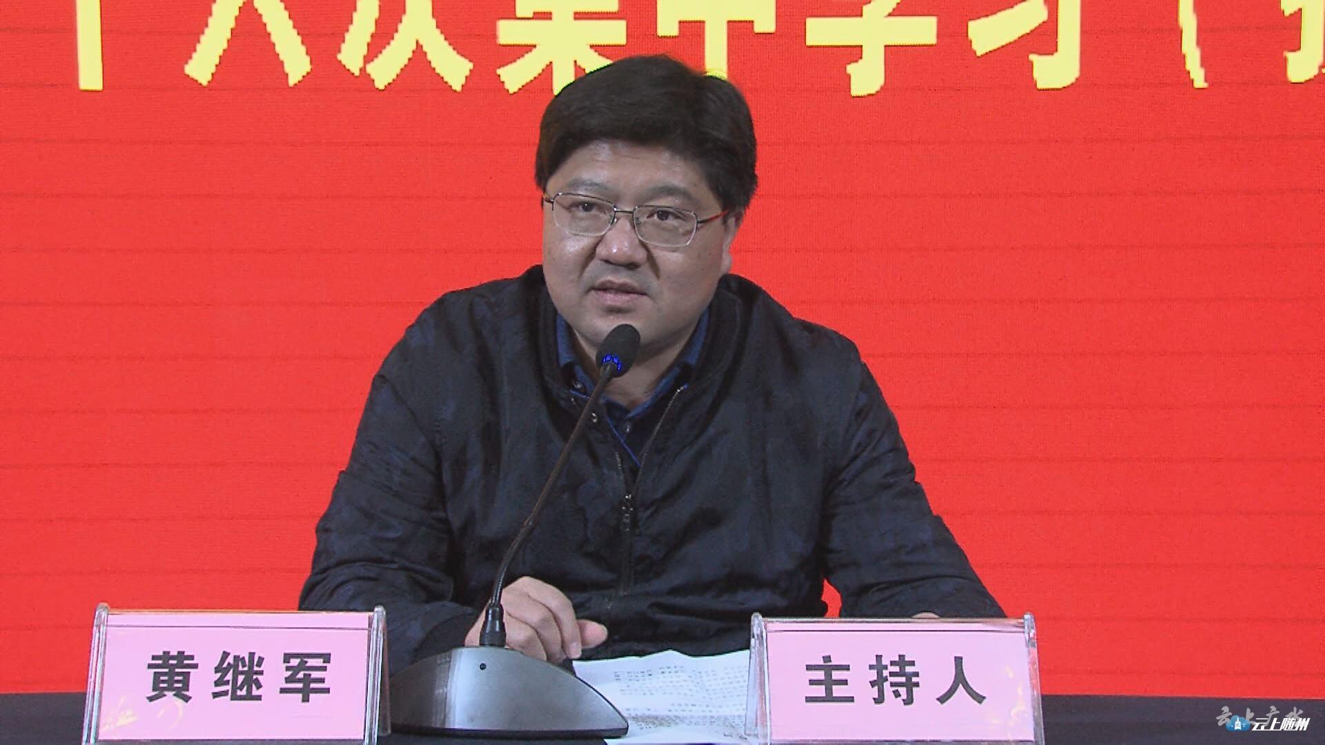 广水市委书记黄继军主持会议并讲话。会上,随州市委宣讲团成员、随州市委组织部常务副部长肖诗兵为大家作了题为《“中国之治”的政治宣言和行动纲领——党的十九届四中全会精神解读》专题辅导报告,肖诗兵站在发展的高度、全局的角度,着重从党的十九届四中全会概况、深刻领会“中国之治”的丰富内涵和精神实质、坚定不移把坚持和加强党的全面领导落到实处、着力构建共商共治共享的基层社会治理新格局等四个方面,对四中全会精神进行了全面系统深刻的讲解。
