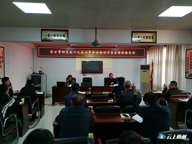12月5日上午,学习贯彻党的十九届四中全会精神市委宣讲团报告会在市民政局二楼会议室举行。市委宣讲团成员、市纪委常委朱汉英作宣讲报告,市民政局党组书记、局长杨河意主持会议,市民政局机关和局属单位干部职工听取报告会。