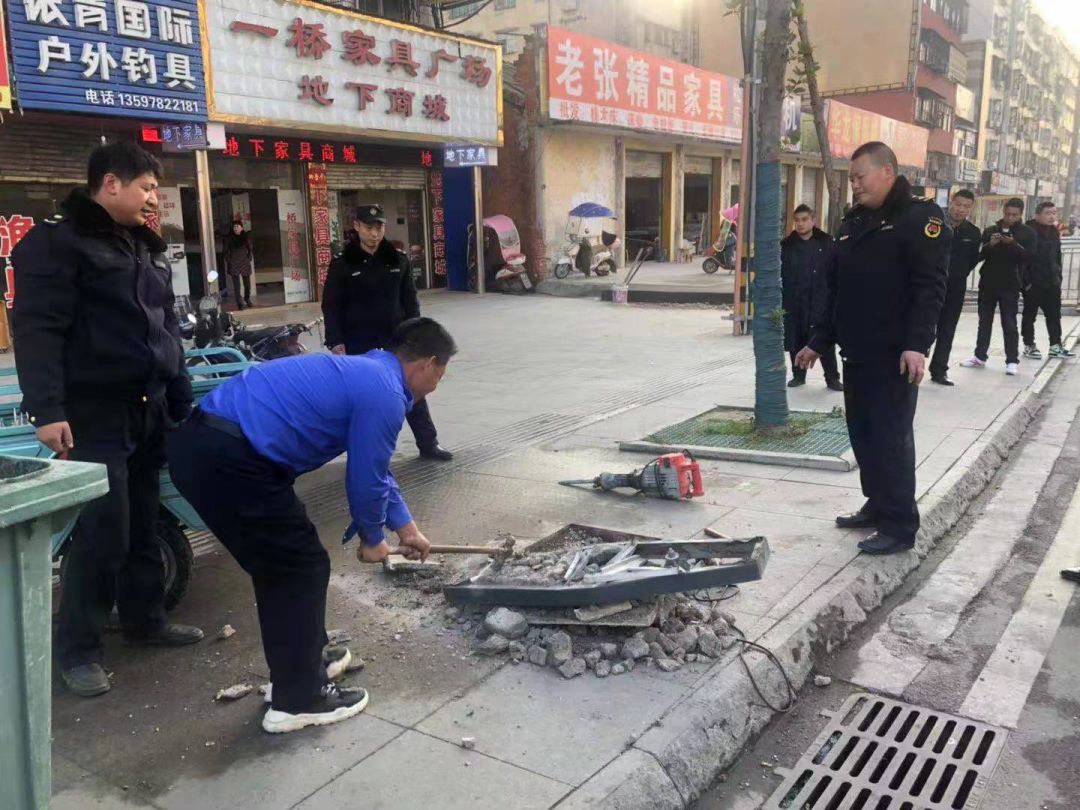 12月11日,南郊办事处联合城管执法人员,对在解放路瓜园社区段历史遗留废弃垃圾桶底座、违规路障进行清理。
