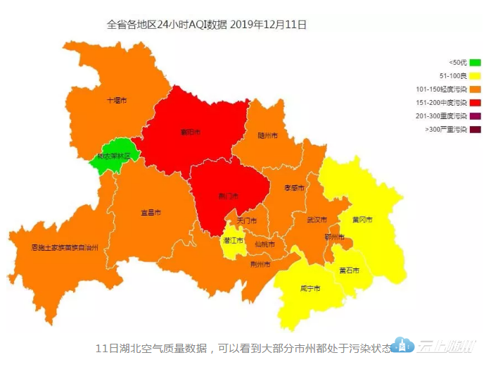 可以看到,湖北多个市州处于污染状态,其中宜昌和荆门处于中度污染,襄阳处于重度污染。