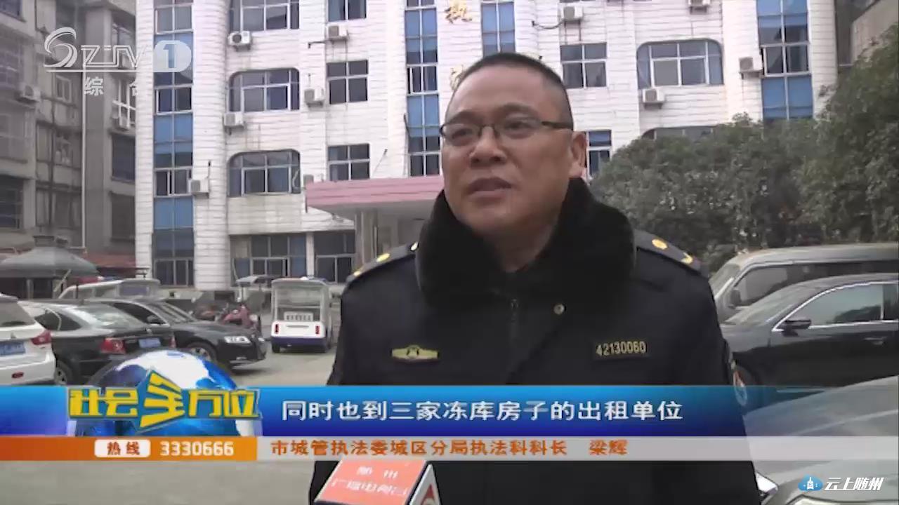(采访:市城管执法委城区分局执法科科长 梁辉)执法人员到现场后找到三家冻库的经营者,告知相关情况,并责成其立即整改,否则依法处罚,同时也到三家冻库房子的出租单位,东城办事处文峰塔社区4组,找到该组的苏队长,苏队长称他们已召开了组居民代表大会,经居民大会讨论决定,若三家经营者不整改到位,一年后收回出租的房子。