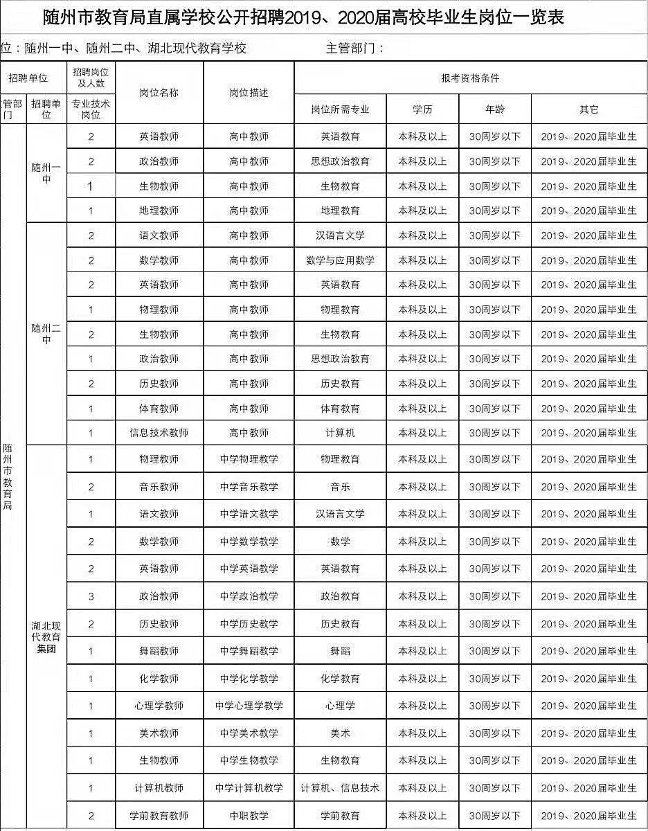 随州市市直高中学校参加本次专项公开招聘,共招聘41人。具体招聘单位及岗位详见《随州市市直高中学校2019年度专项公开招聘教师岗位表》(以下简称《岗位表》)。