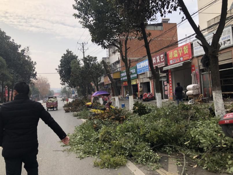 12月19日,何店镇对镇区街道两旁的树木进行集中整修。