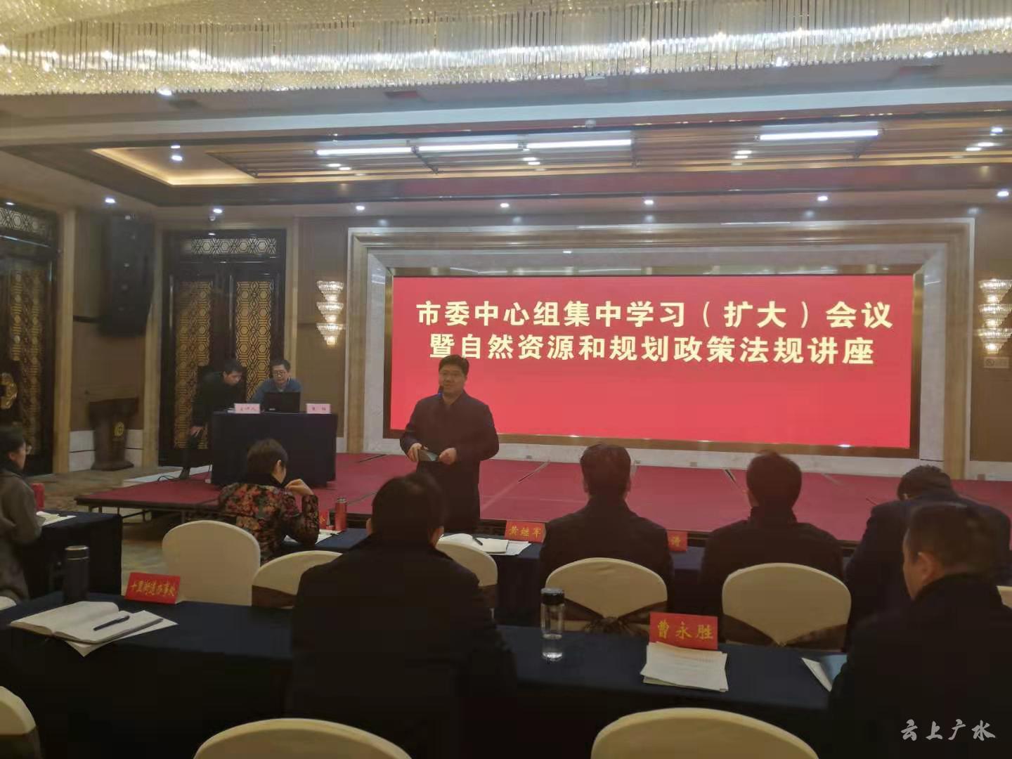 为深入贯彻落实党的十九届四中全会关于生态文明建设战略部署,加快生态文明建设步伐。12月20日,广水市委中心组召开集中学习(扩大)会议暨自然资源和规划政策法规知识讲座。