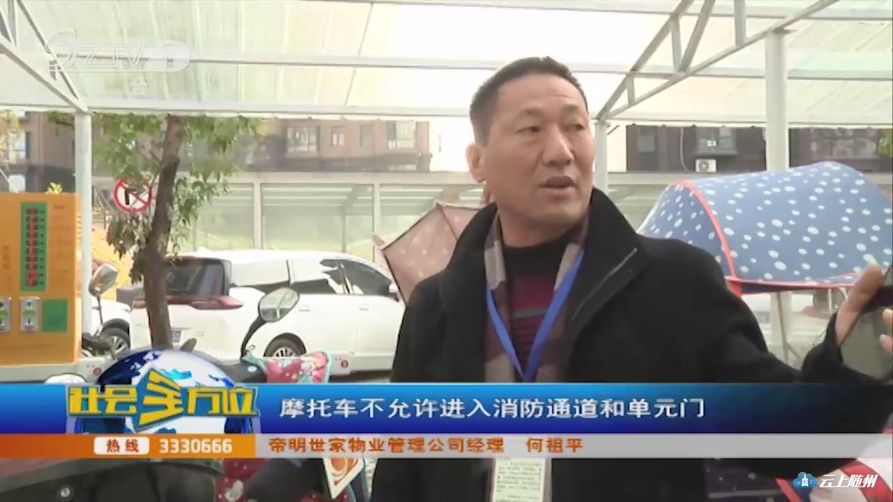 【采访 帝明世家物业管理公司经理 何祖平】停车棚里面一是安全,因为我们这里有摄像头都看得到,如果丢失了监控可以看到,保安巡逻也能看到,也是为了业主的安全。再一个,停车棚建在环形路旁边。摩托车不允许进入消防通道和单元门。停在楼道交通也不方便,(如果电动车充电)发生了火灾不安全,另外车棚里的充电桩也建好了,收费是一块钱充5个小时。