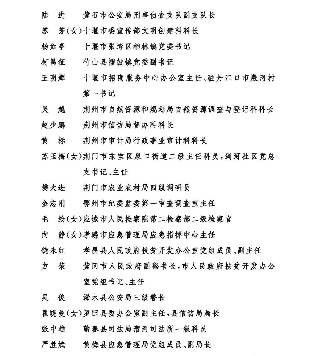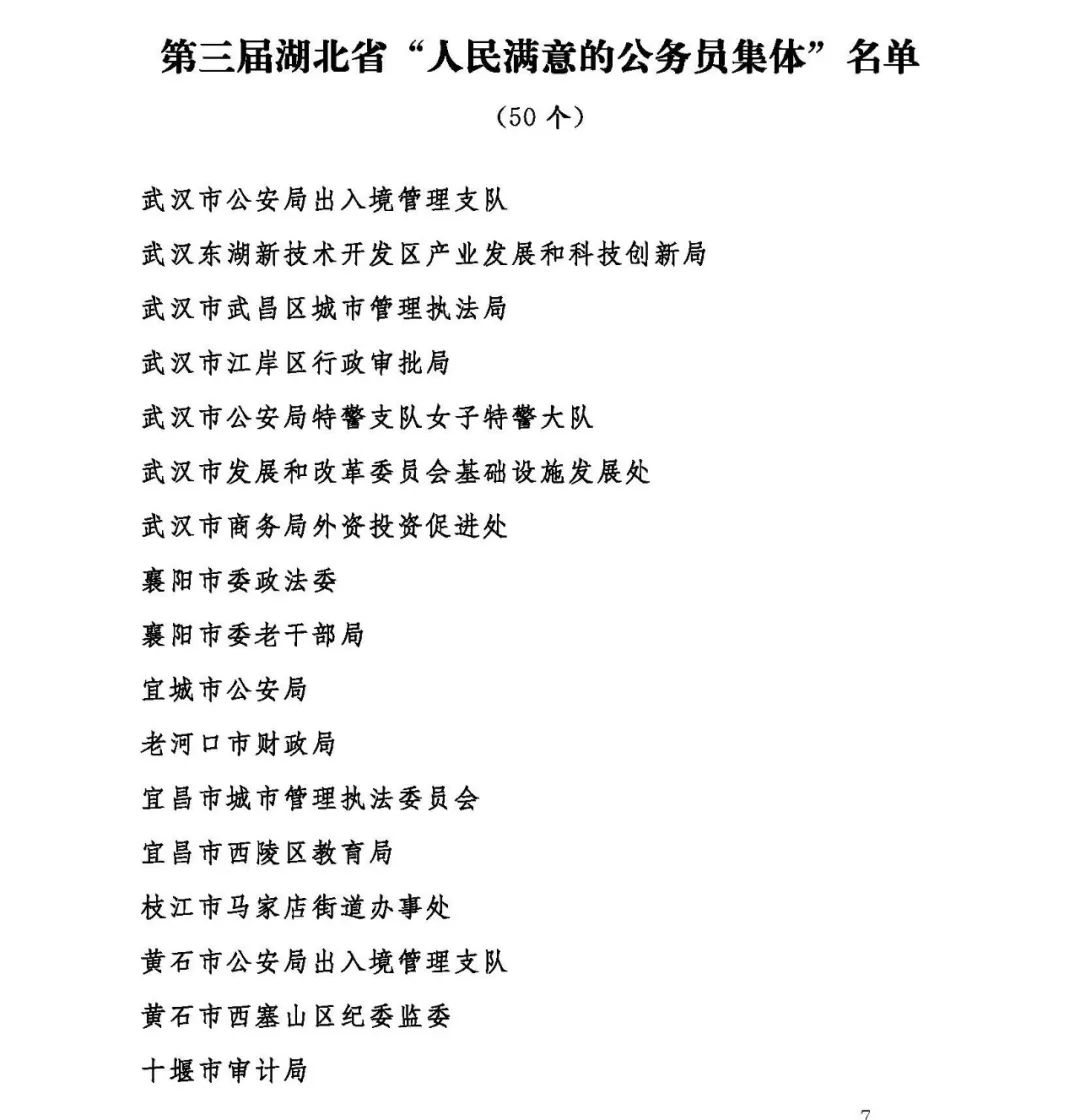 记者从会上获悉,为表彰先进、弘扬正气,激励全省广大公务员不忘初心、牢记使命,在新时代展现新担当新作为,省委、省政府决定,授予吴俊等48名同志“人民满意的公务员”称号,授予武汉市公安局出入境管理支队等50个单位“人民满意的公务员集体”称号;给予金红兵等48名同志和武汉市硚口区应急管理局等20个公务员集体记一等功 (名单附后) 。
