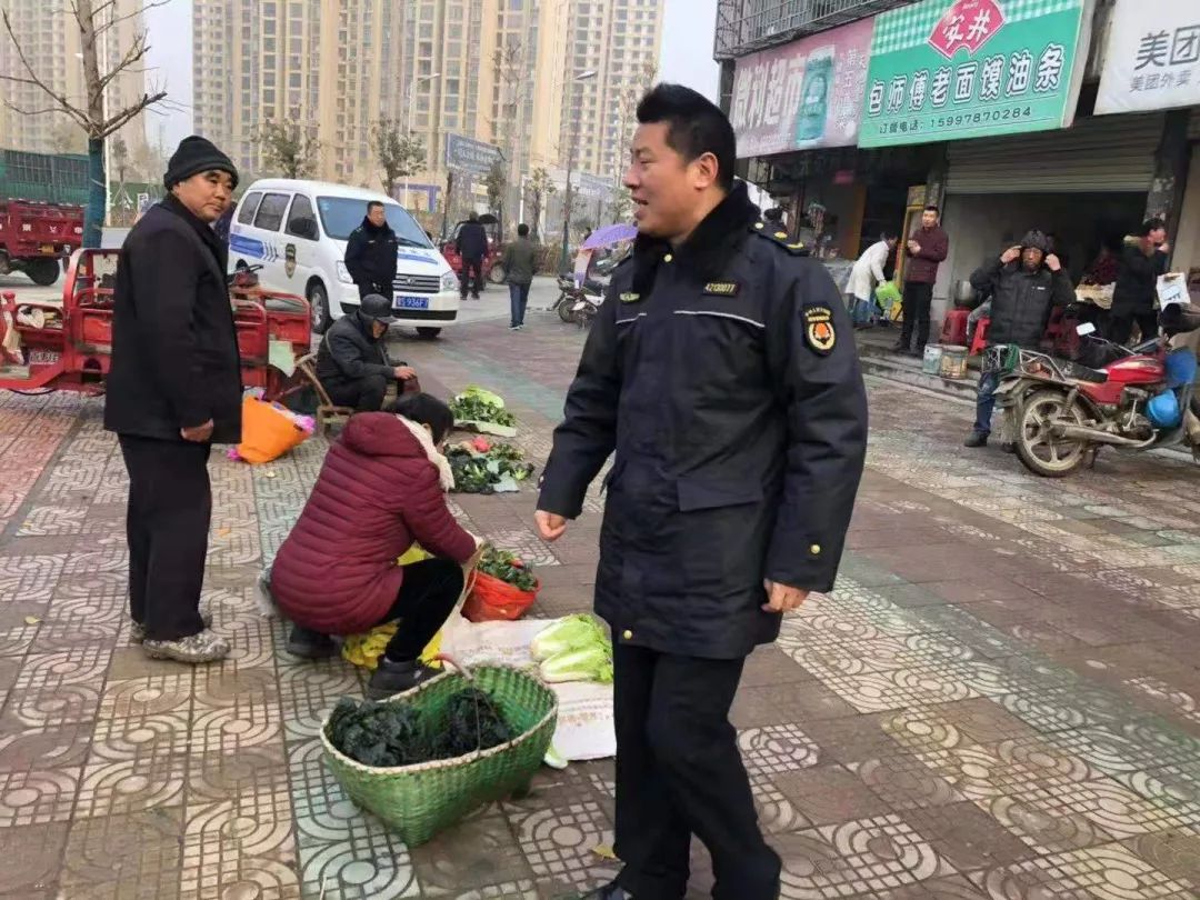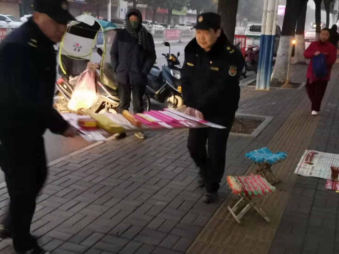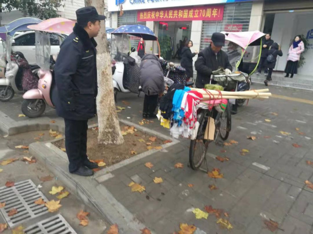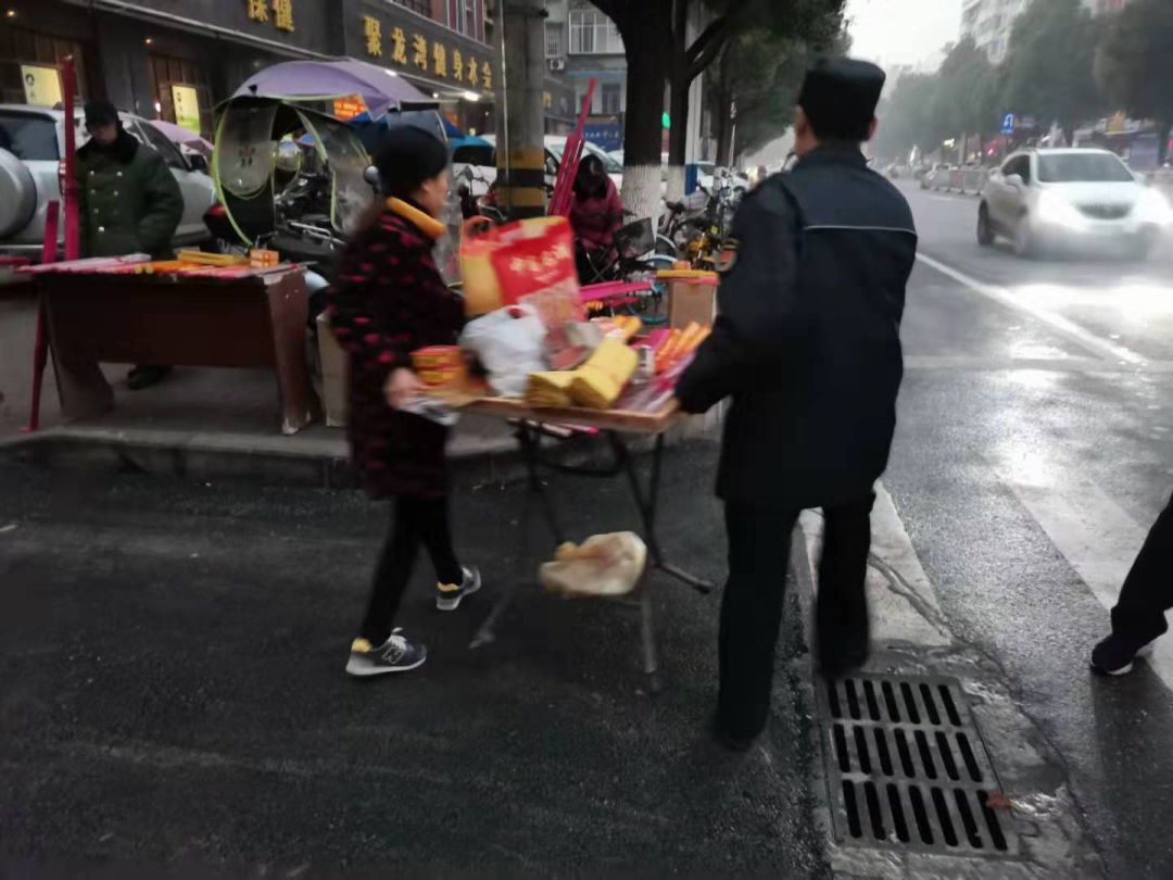 12月26日,南郊办事处联合城管人员,在南郊金三角执勤,劝导流动摊贩。