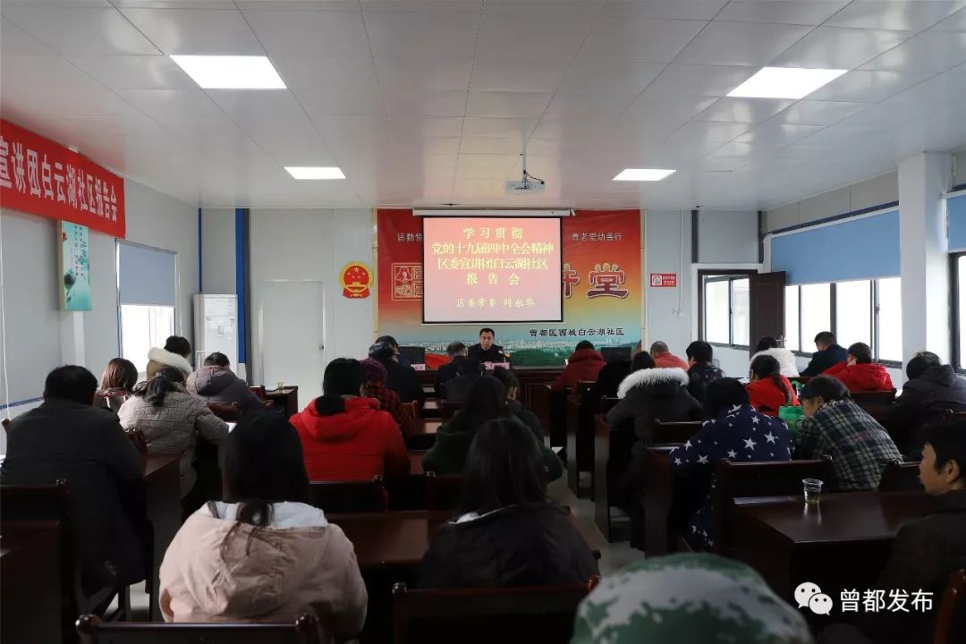 12月30日,曾都区委宣讲团成员、区委常委刘永华到西城办事处白云湖社区宣讲党的十九届四中全会精神。