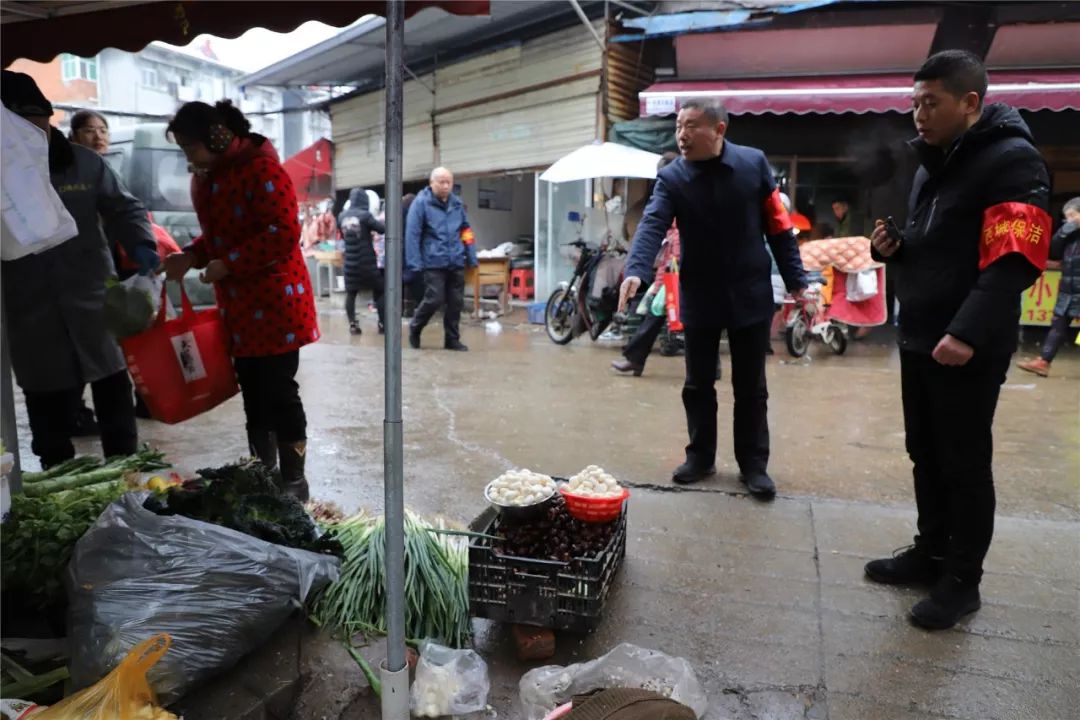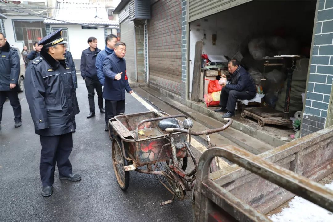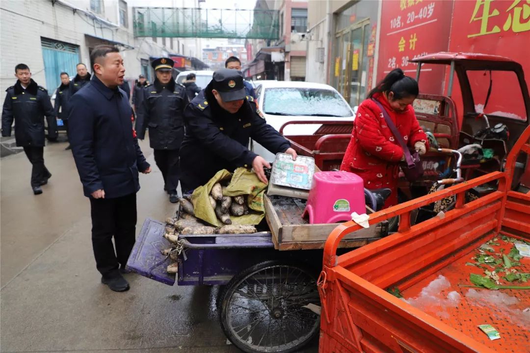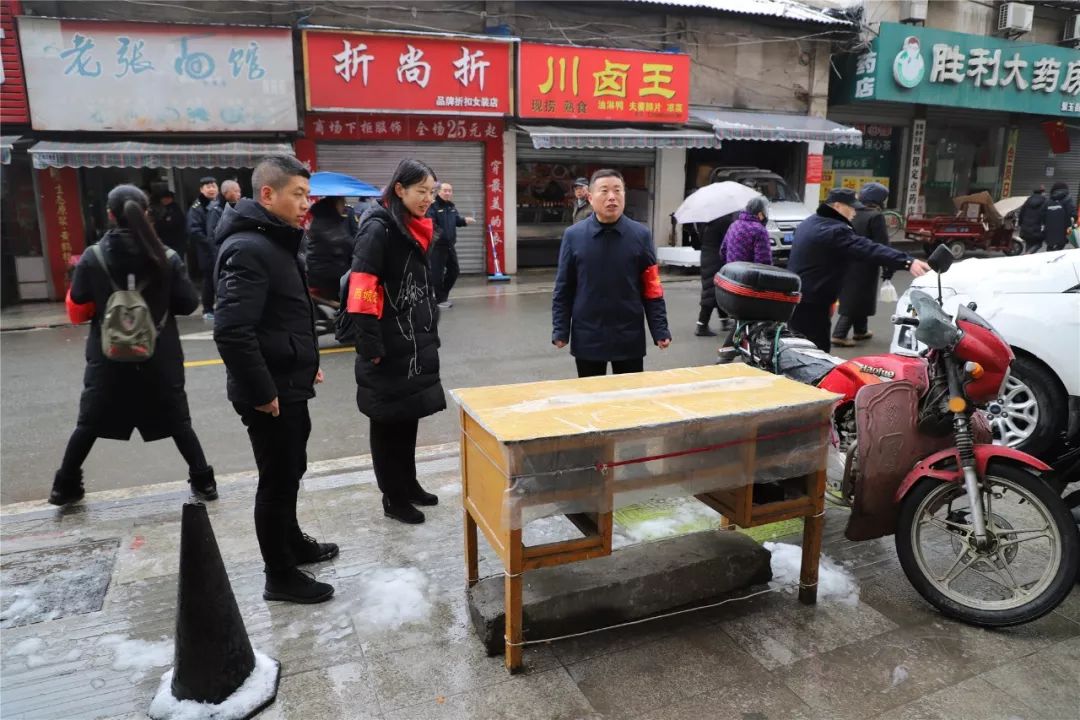 早九点,寒风凛冽,雪花飞扬,在简短的动员会后,专班开始对水西门菜场开展集中整治。