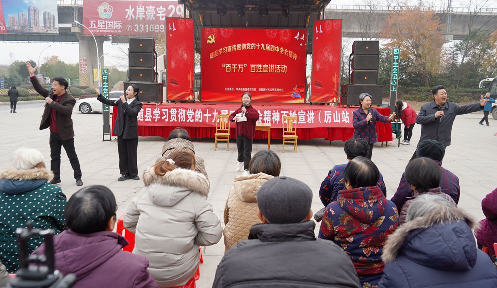 2019年12月,随县县委宣传部抽调各类优秀人才和宣讲志愿者组建党的十九届四中全会精神百姓宣讲团,开展“走百村进千湾入万户”百姓宣讲活动,推动党的十九届四中全会精神在随县大地落地生根、开花结果。百姓宣讲员把“大道理”转化为“大白话”,把“好声音”转化为“好故事”,用最接地气的宣讲方式,以老百姓喜闻乐见的文艺形式,向广大干部群众宣传党的十九届四中全会精神,推动党的创新理论“飞入寻常百姓家”。