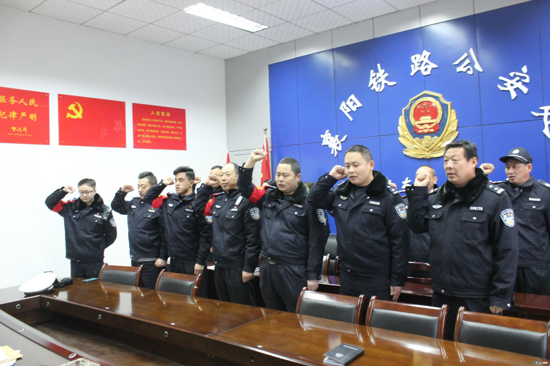 青年民警胡群带领民警面对警徽庄严宣誓,表示要不忘初心、牢记使命,坚持人民公安为人民服务宗旨的责任担当,以满足人民日益增长的美好生活需要为导向,从强化安全保障措施、确保旅客平安出行入手,履职尽责,认真落实各项春运安保工作措施,保证线路安全畅通,加强旅客乘降组织,维护春运安全环境,强化应急处置管理,以优质的服务、优良的环境、优秀的业绩,接受党和人民检阅!