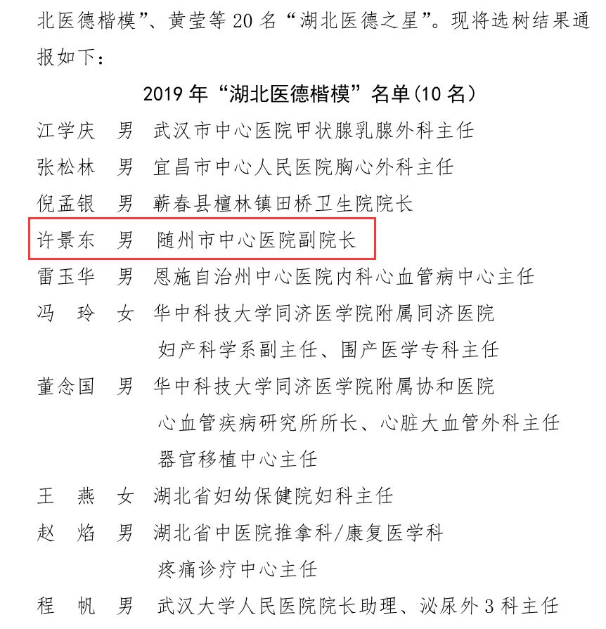 日前,从湖北省总工会获悉,随州市中心医院党委委员、副院长许景东荣获2019年“湖北医德楷模”。据了解,此次评选活动由省总工会、省卫健委组织,在各地选拔推荐的基础上,经专家评审委员会评选、公示等相关程序,选树产生了10名“湖北医德楷模”和20名“湖北医德之星”。其中,“湖北医德楷模”由省总工会授予“湖北五一劳动奖章”。