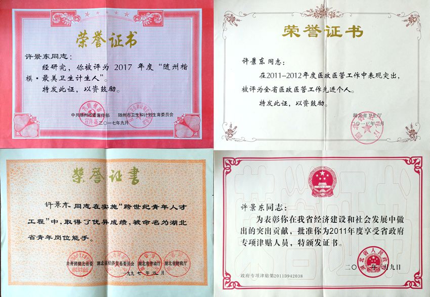 一份耕耘,一份收获,许景东教授的高尚医德和精湛医术深受社会各界和广大病友的充分肯定,湖北省省政府专项津贴专家、湖北省医政医管先进个人、湖北省“青年岗位能手”、“随州市市管专业技术拔尖人才”、“随州市青年科技标兵”、“ 随州市十佳医生”、首届“随州名医”、“随州市健康卫士”、“随州楷模.最美卫生计生人”、“随州名医”等荣誉接踵而至,一份份感谢信、一面面锦旗纷至沓来。面对荣誉,许景东总是淡然一笑:“荣誉代表过去,我们必须牢记医务工作者的职责和使命,学海无涯,医海无边,只有不断进取,才能与时代同步。”