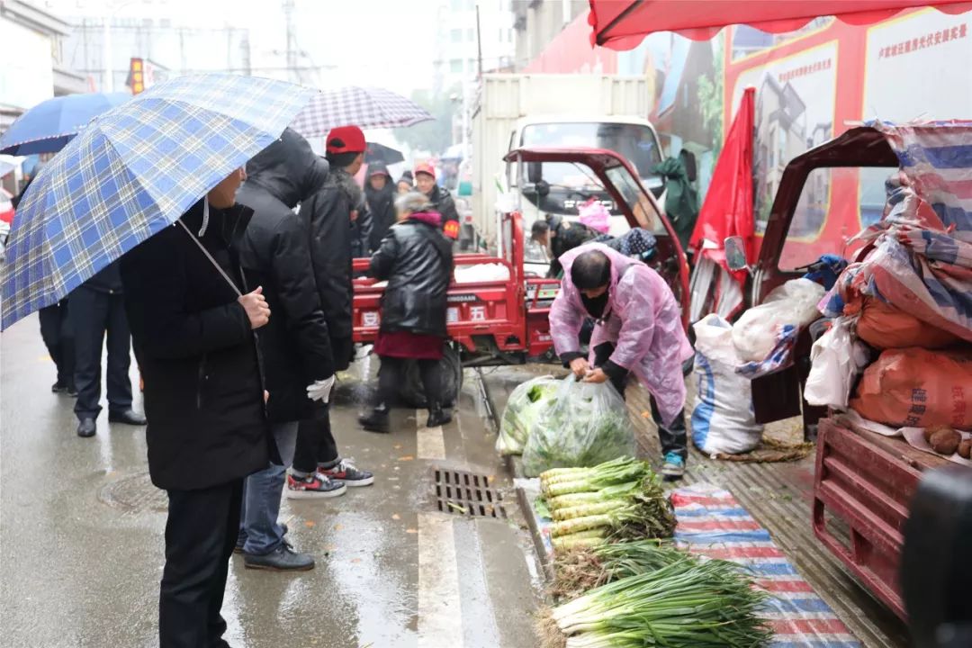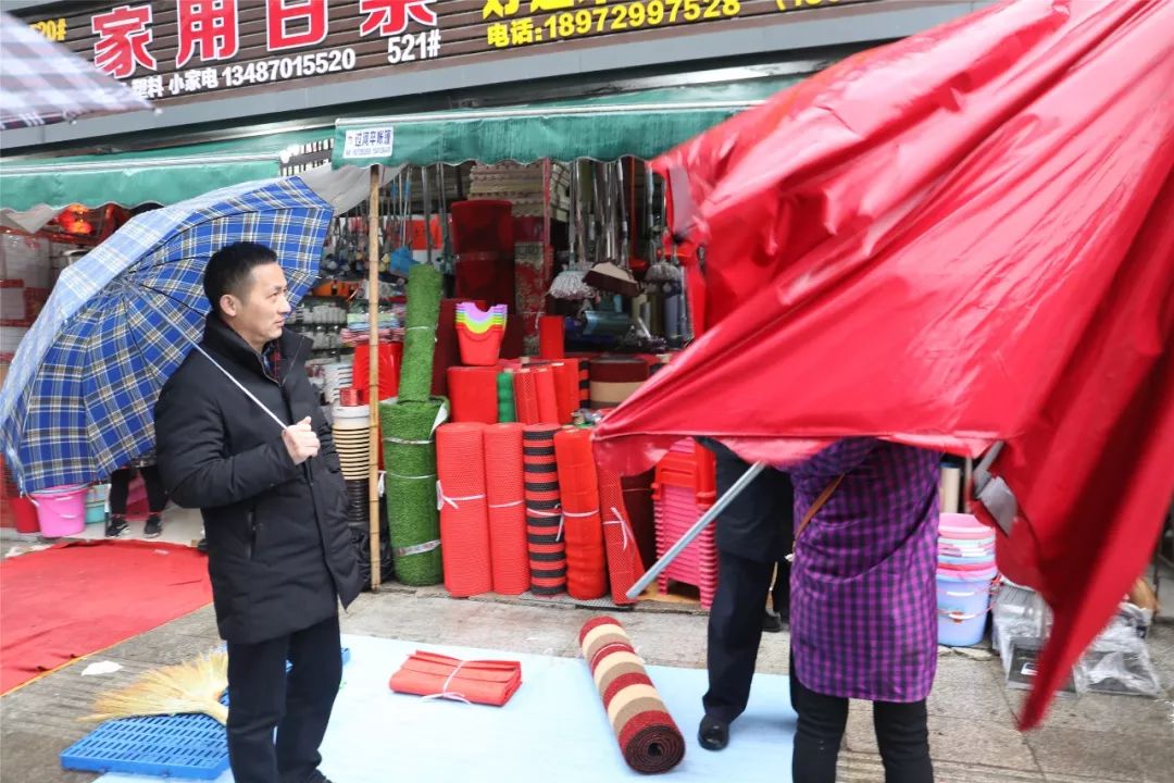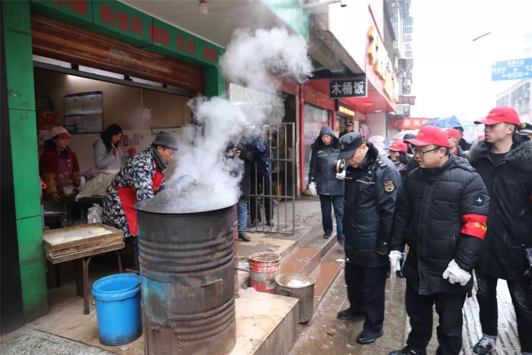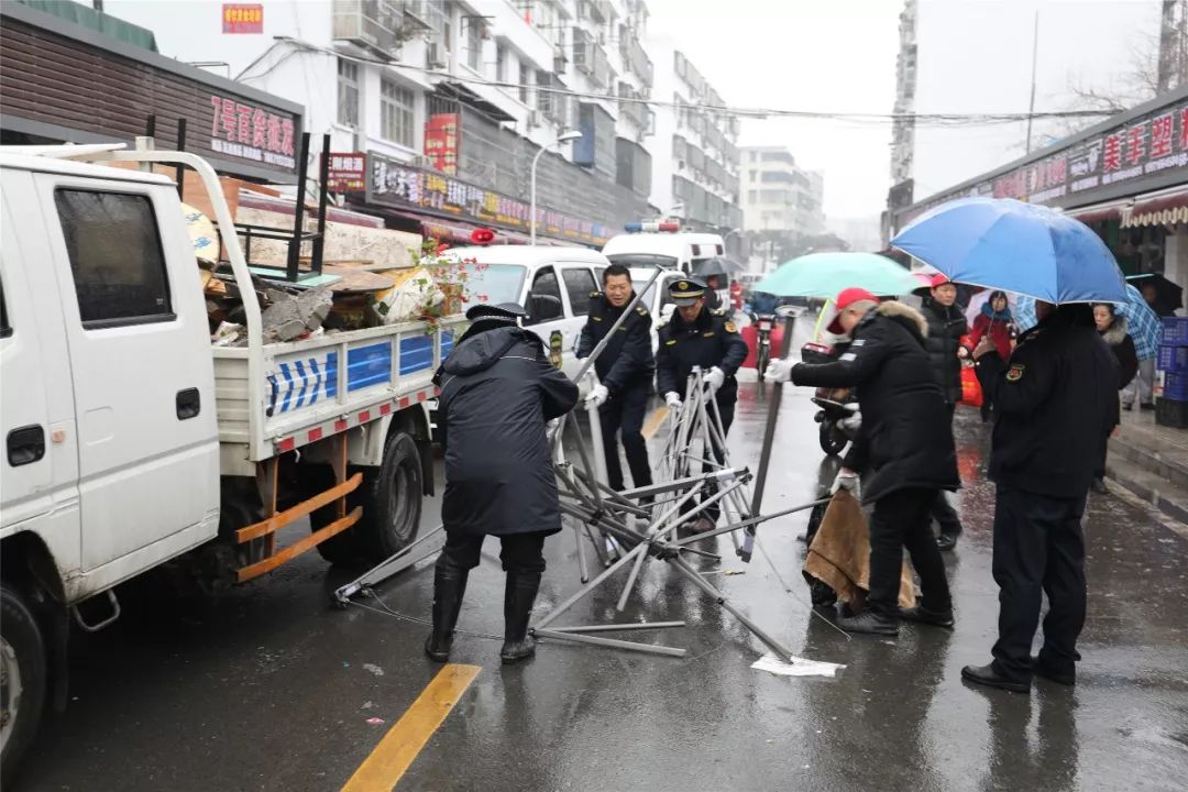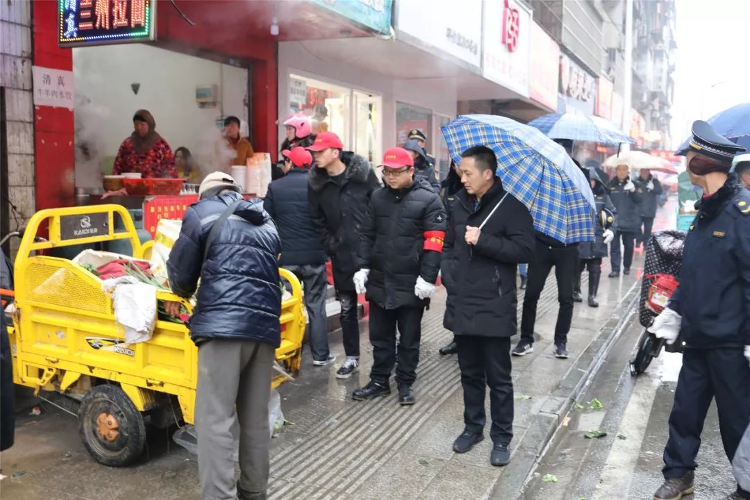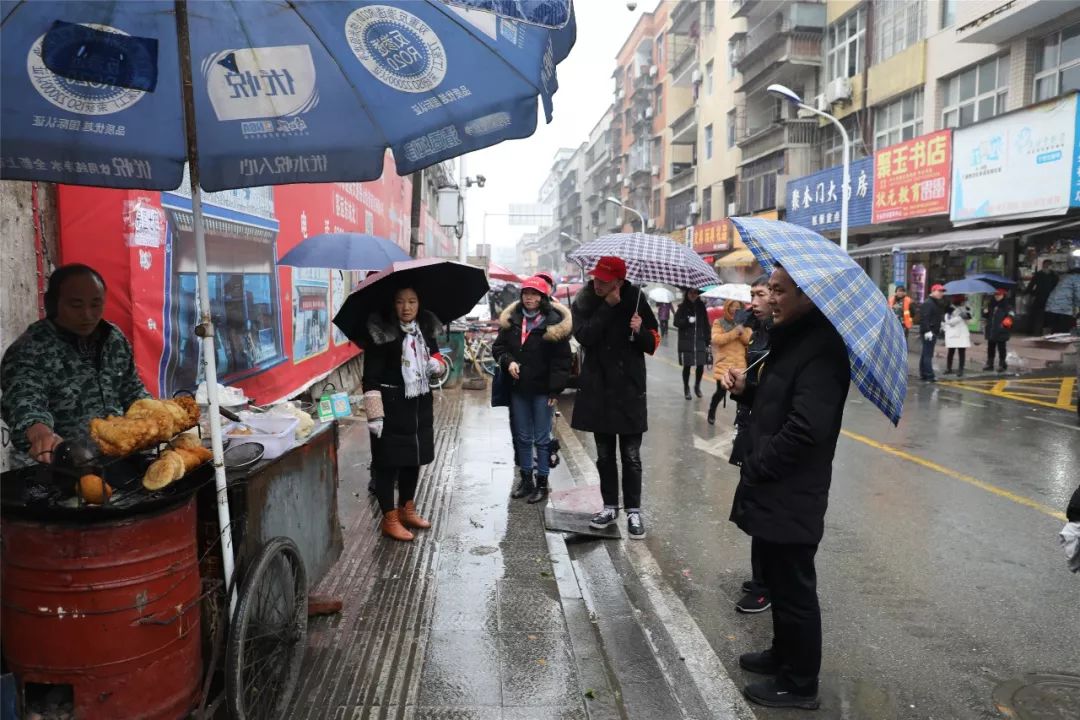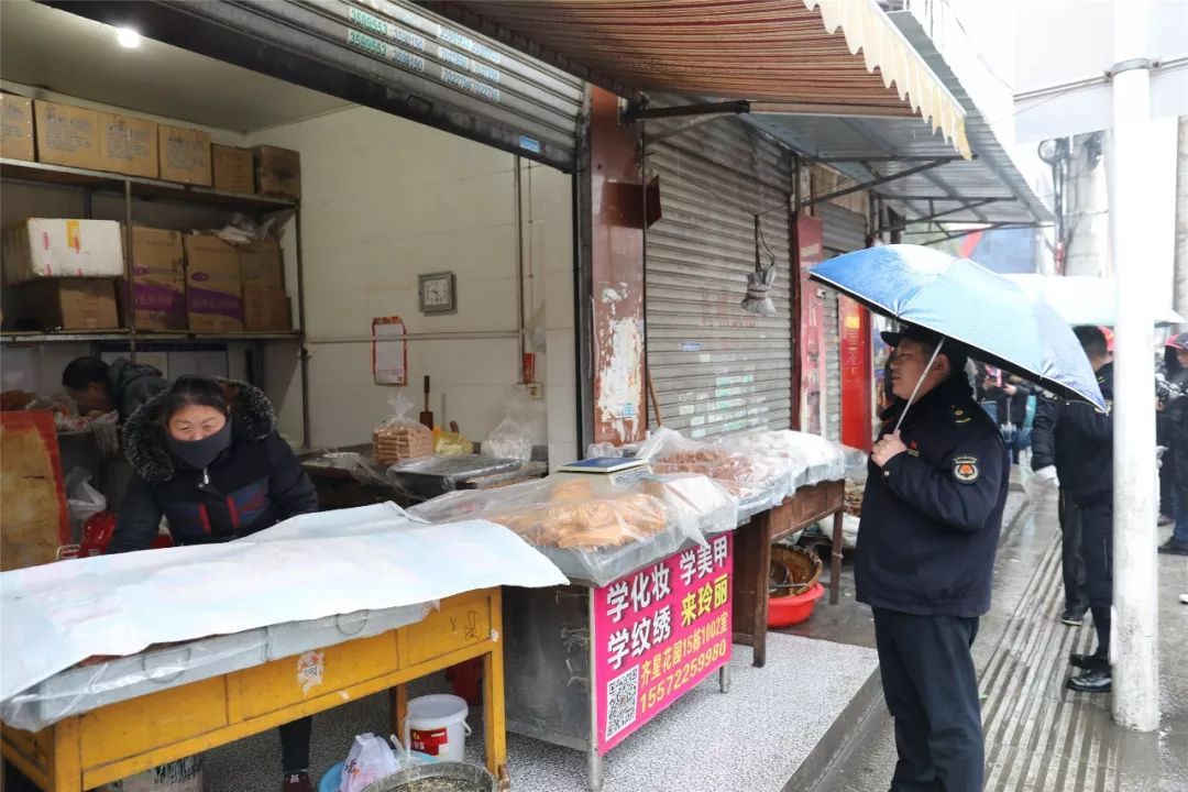 9点半,天气愈加寒冷,雨水已经变成雪花,但专班人员的整治热情丝毫不减。专班人员来到聚奎门学校门口,这里早餐店多,许多推车的商贩也经常在路边占个位子。