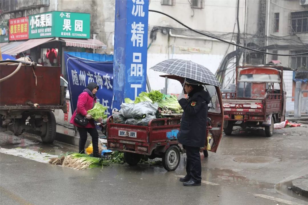 “老师傅,这周围来往车辆多,多不安全啊,麻烦把菜都收一下,旁边有菜场,卖菜统一都在那。”