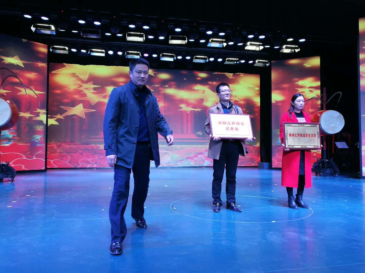 随州广播电视台台长陈德军为蒋方馆长授读者生活馆牌