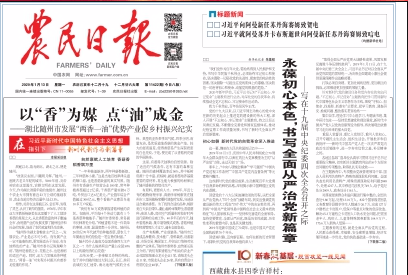 1月13日,农民日报头版头条刊登了标题为《“香”为媒 点“油”成金——湖北随州市发展“两香一油”优势产业促乡村振兴纪实》的文章,全面介绍了我市利用优势产业促进乡村振兴的经验和做法。
