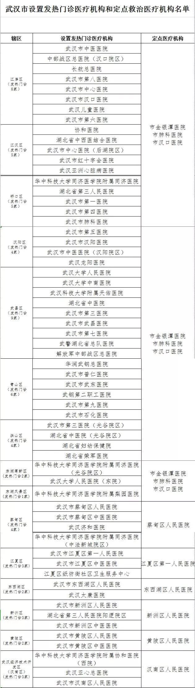 为进一步方便市民群众看病就医,1月20日,武汉市卫生健康委在官网公布了全市发热门诊医疗机构和定点救治医疗机构名单。全市发热门诊61家,其中,中心城区41家,新城区20家,市管医院16家;全市定点医疗机构9家,其中,中心城区定点医疗机构为市金银潭医院、市肺科医院、市汉口医院,远城区定点医疗机构为各区人民医院。组建了省市联合医疗救治专家组,专家成员25人,其中,同济医院5人,协和医院5人,省人民医院3人,中南医院4人,市第一医院1人,市中心医院1人,市第三医院1人,市第四医院1人,武汉儿童医院2人,市金银潭医院2人。