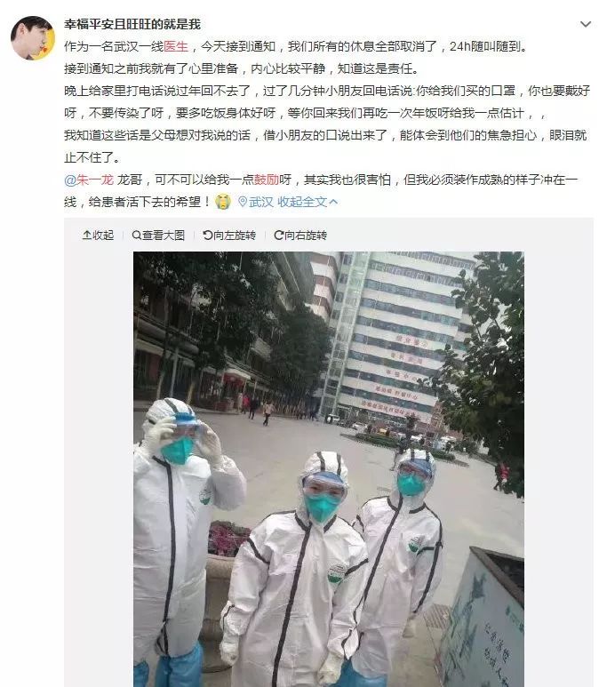 毫无怨言,始终坚守,正如武汉一线医生@幸福平安且旺旺的就是我 所说,这是责任:接到通知(24h随叫随到)前就有了心理准备,内心比较平静,知道这是责任。
